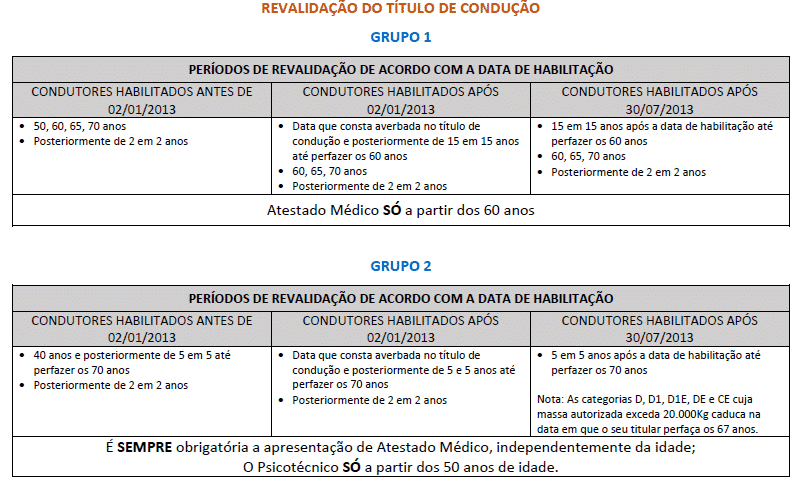 A revalidação da carta de condução deve ser feita durante os 6 meses que antecedem o dia em que o condutor completa a idade obrigatória e de acordo com a categoria do veículo.